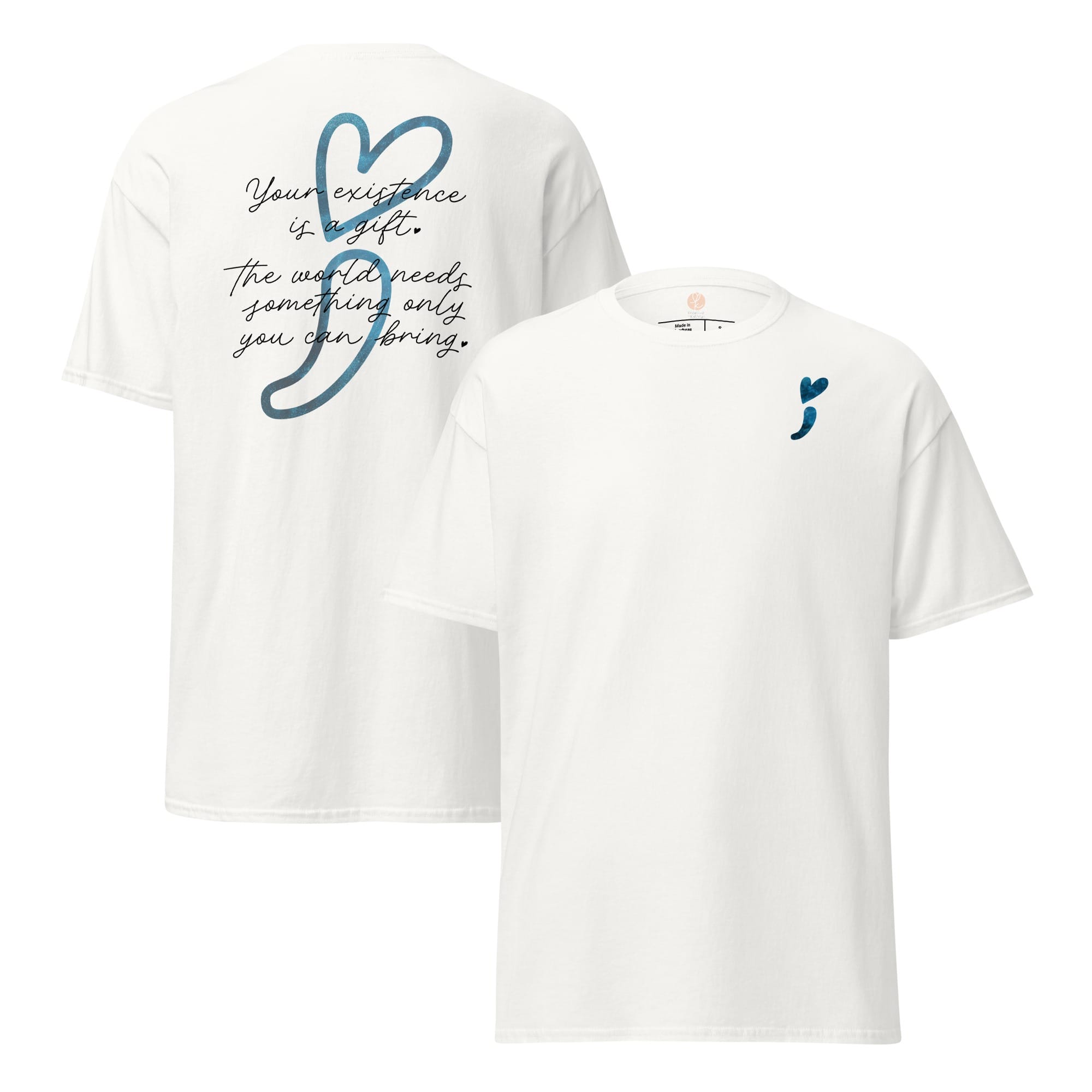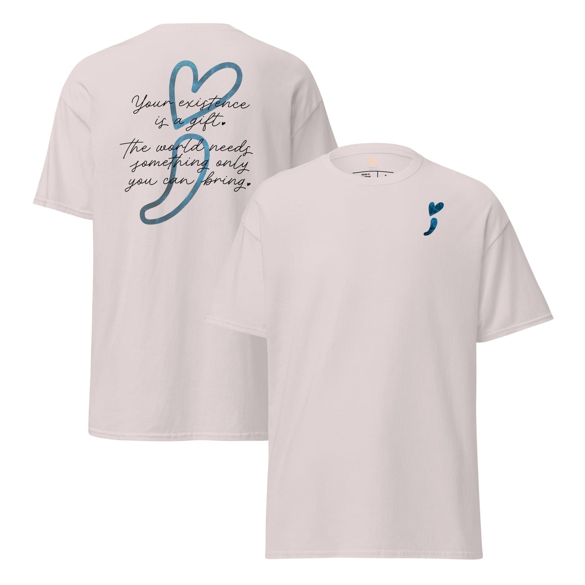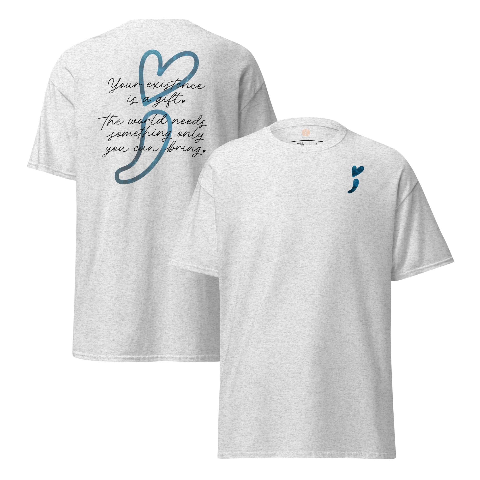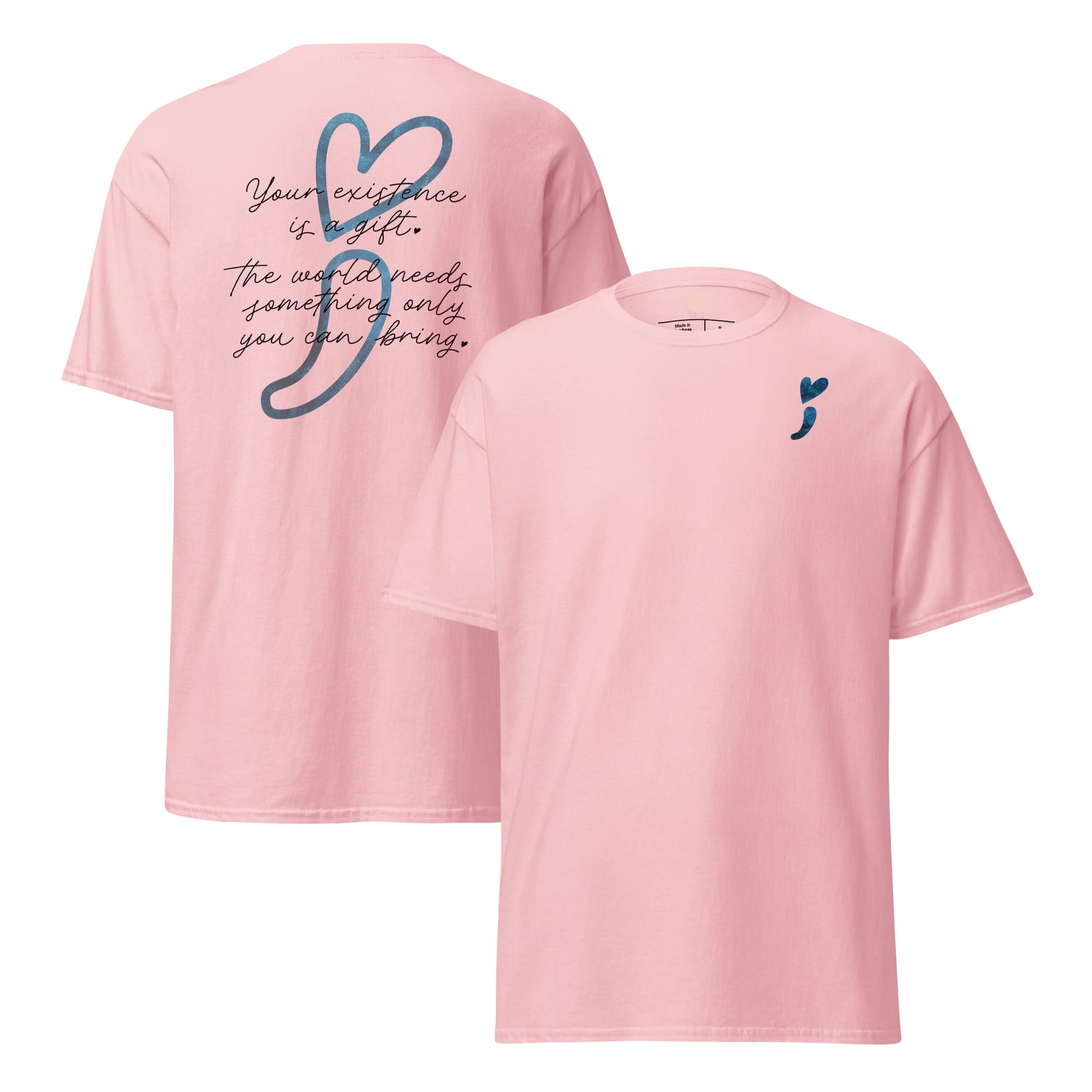 Wear your heart on your sleeveโliterally! This “Stay Positive” classic tee is your new wardrobe MVP, crafted to sprinkle good vibes all around. With a cheeky reminder that โYour existence is a gift,โ and a playful blue galaxy heart-shaped semicolon, it’s all about keeping hope afloat! Made from 100% cotton, this unisex tee is as soft as a cloud and sharp enough to cut through negativity. Whether you’re layering it up or rocking it solo, get ready to make waves and remind the world that youโre a positivity powerhouse!